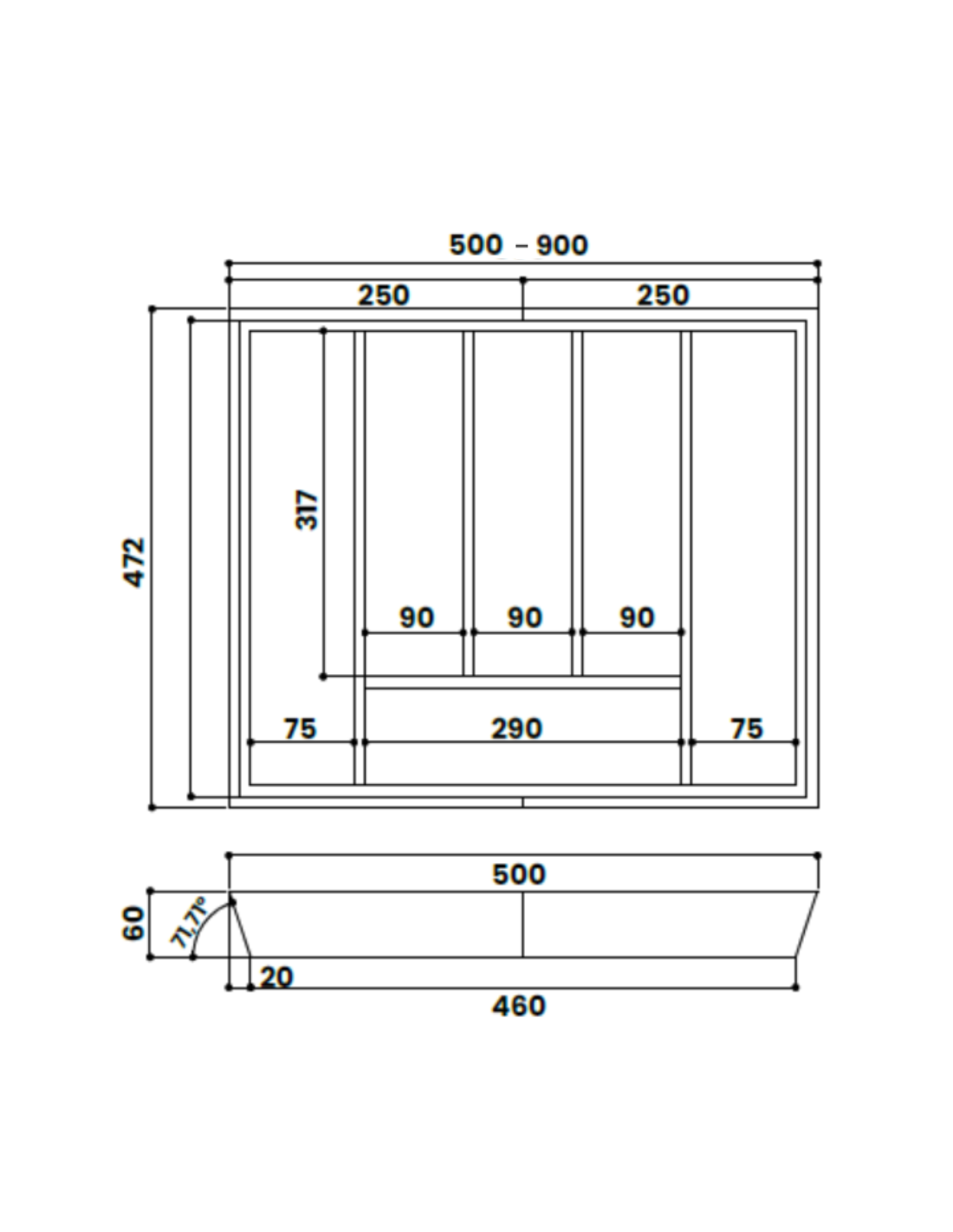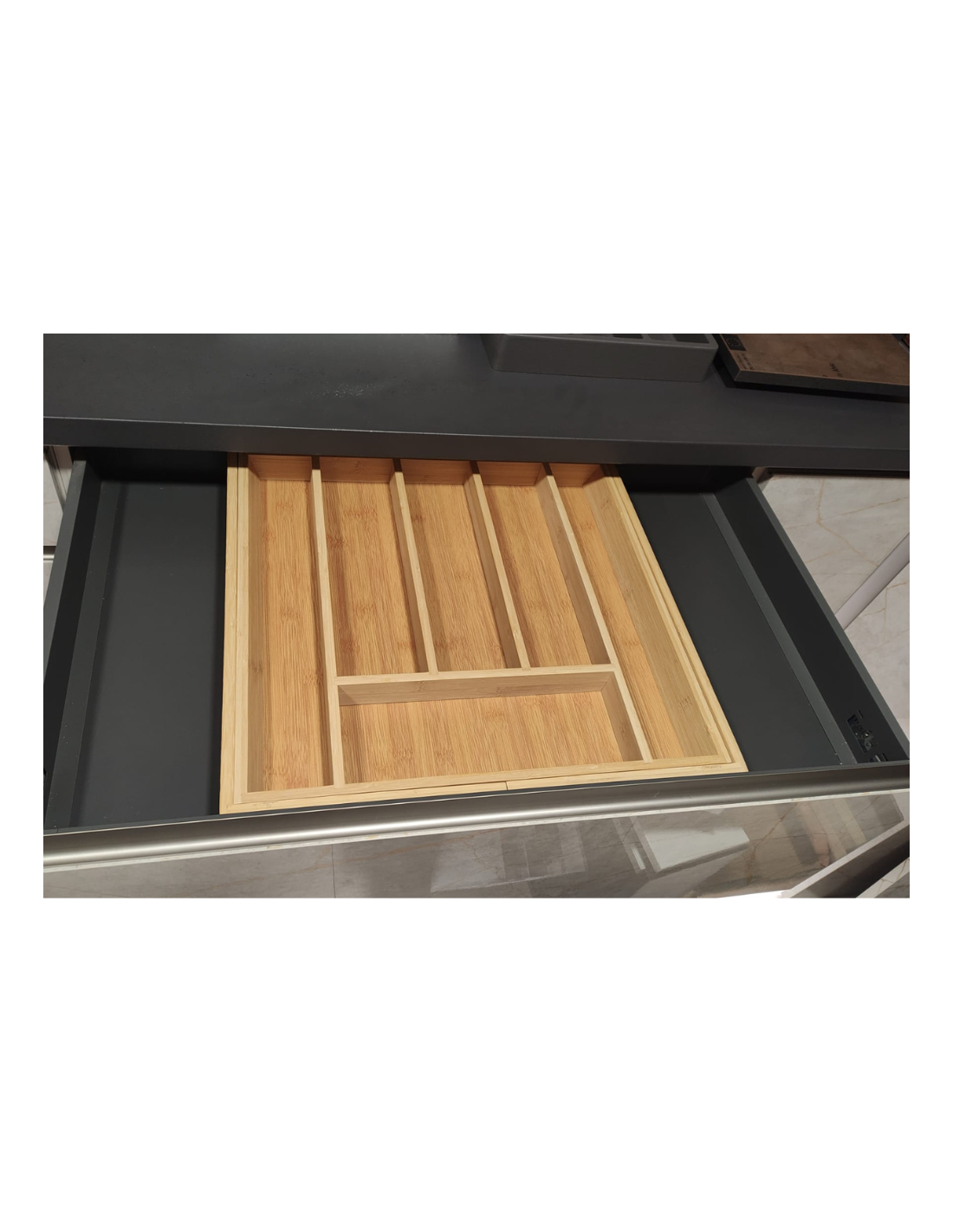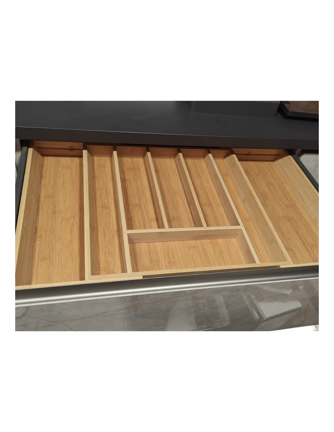 Cubertero de madera de bambú adaptable para módulo desde 60 hasta 90cm. Mediante un sistema deslizante permite ajustarse también a medidas intermedias. Totalmente ecológico y reciclable es perfecto para dar un toque minimalista y moderno a la cocina.