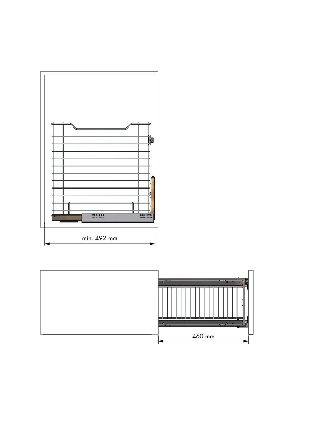 Tolva con guías Hettich. Con cierre amortiguador y extracción total. Carga maxima de 30 Kg. Adaptable para módulos de 16 y 19 mm.