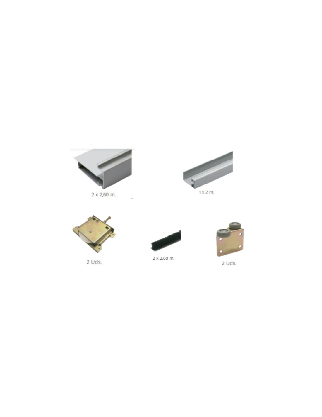 Kit de Armario Plata ATTIVO para tablero de 10mm incluye guía y kit de puerta (perfil tirador para ambos lados de 2,60m en aluminio plata, perfil en "U" superior e inferior de 1m en aluminio plata, juego de ruedas inferiores y superiores y felpudos laterales). Las guías de 2m incluyen 2 kits de puerta y las guías de 3m incluyen 3 kits de puerta.