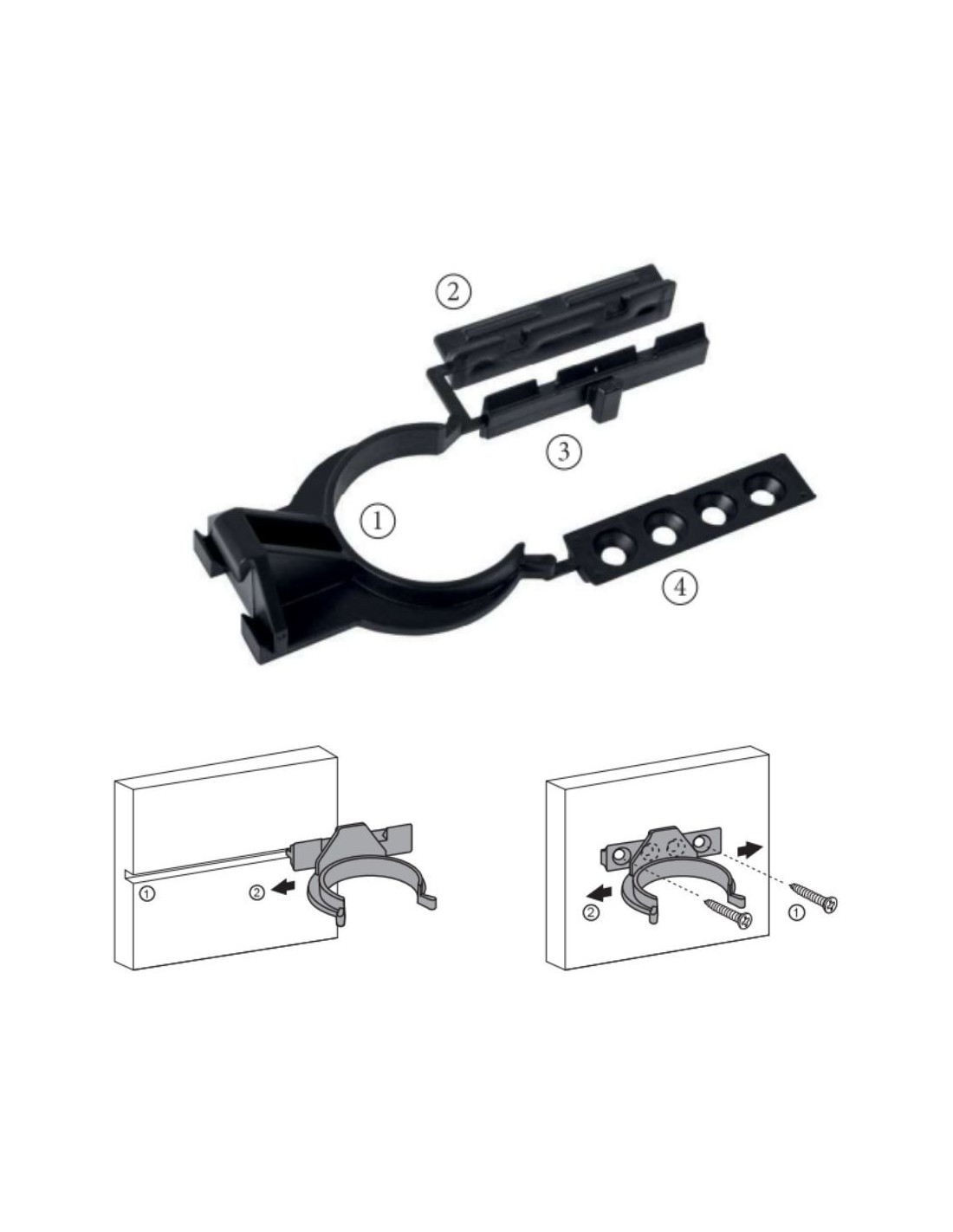 Pinza Negra Polivalente VAL, adecuada para la sujeción de la pata STRONG al zócalo de PVC, auminio o madera.