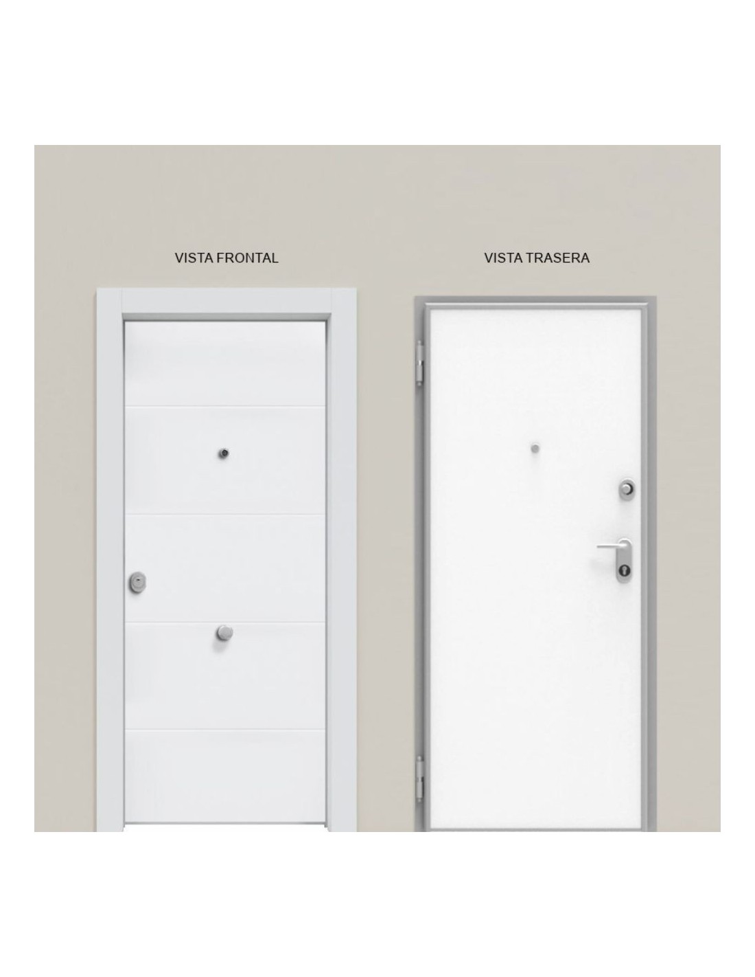 Puerta acorazada, con un grado 3 de seguridad y aislamiento acústico de 27 dB. Incorporando el pomo central, la manivela y la mirilla. Incluye los paneles decorativos especificados y el premarco metálico + el premarco de madera. Las medidas de paso disponibles son: 804x2014 / 2034. Para tabique de 14 con tapetas incluidas (premarco mixto). Con posibilidad de complementos adicionales, para más información, póngase en contacto. Marco y paneles no colocados.