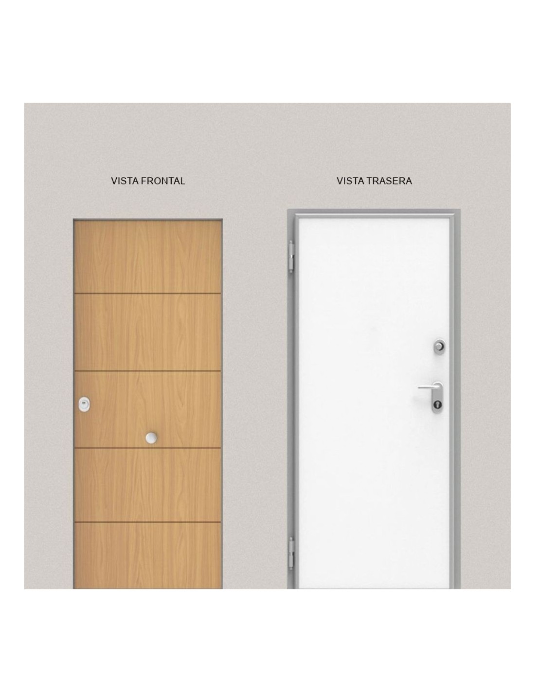 Puerta acorazada, con un grado 3 de seguridad y aislamiento acústico de 27 dB. Incorporando el pomo central, la manivela y la mirilla. Incluye los paneles decorativos especificados y el premarco metálico con pletina (Instalación B). Las medidas de paso disponibles son: 804 / 904 x 2034. Con posibilidad de complementos adicionales, para más información, póngase en contacto. Panel de PVC y MDF lacado.