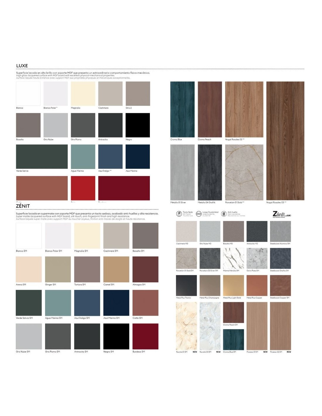 La gama Luxe se compone por una serie de colores lacados con un acabado brillo sobre una base de mdf, la cual presenta extraordinarios comportamientos físico-mecánicos. Hay colores puntuales sujetos a tarifas especiales, no dude en consultarnos. El repertorio de colores puede ser modificado sin previo aviso.