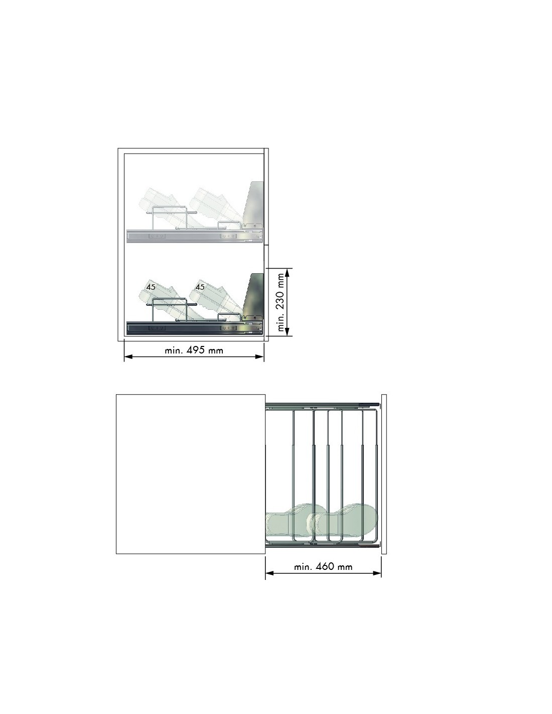 Zapatero extraible, con guias correderas con absorción total y extracción total. Carga maxima de 45 Kg.