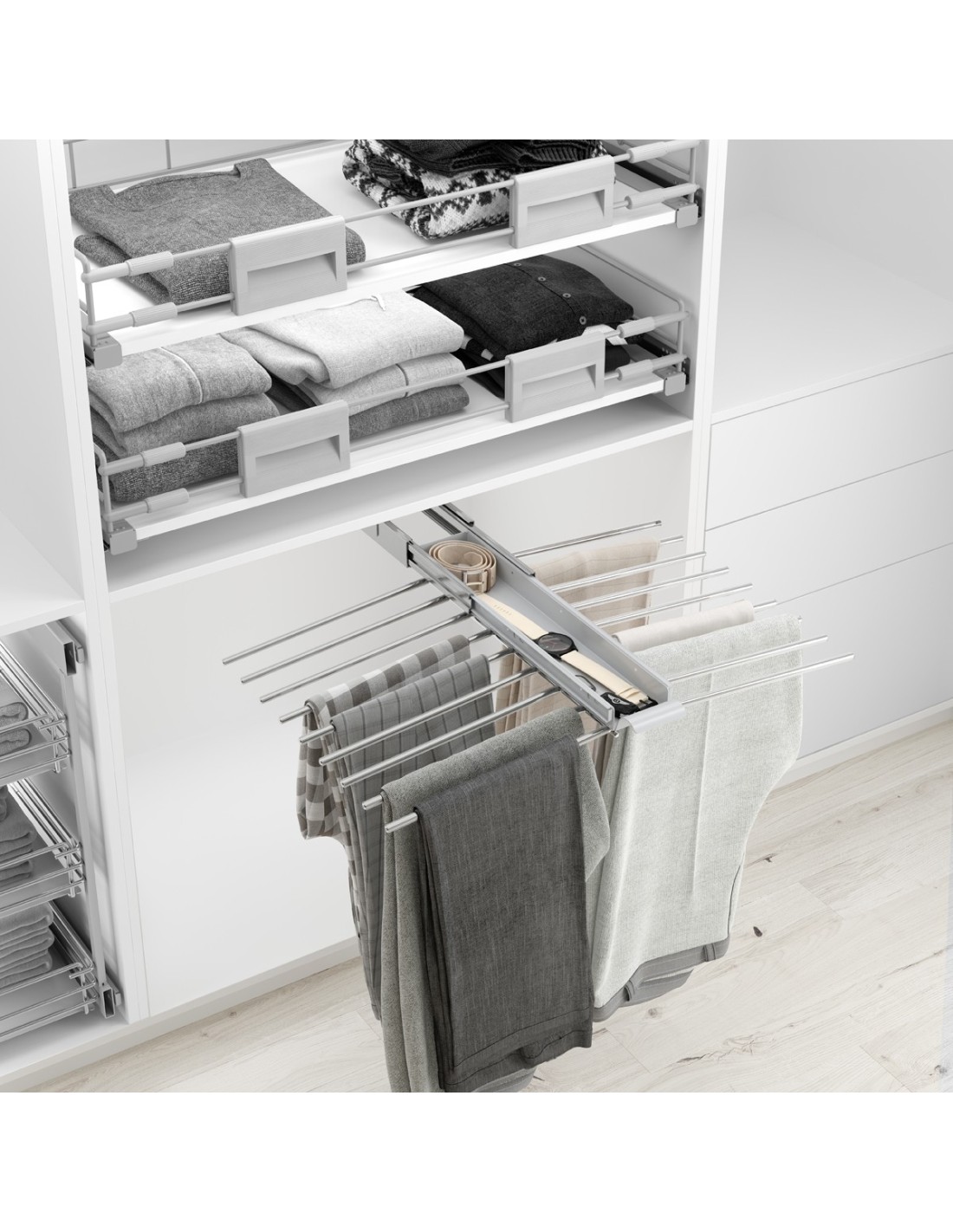 Pantalonero extraible Plus. Cuenta con soportes con funda antideslizante, con bandeja porta-objetos y con cierre amortiguado. Carga maxima de 30 Kg. Diseñado para 9 pantalones.