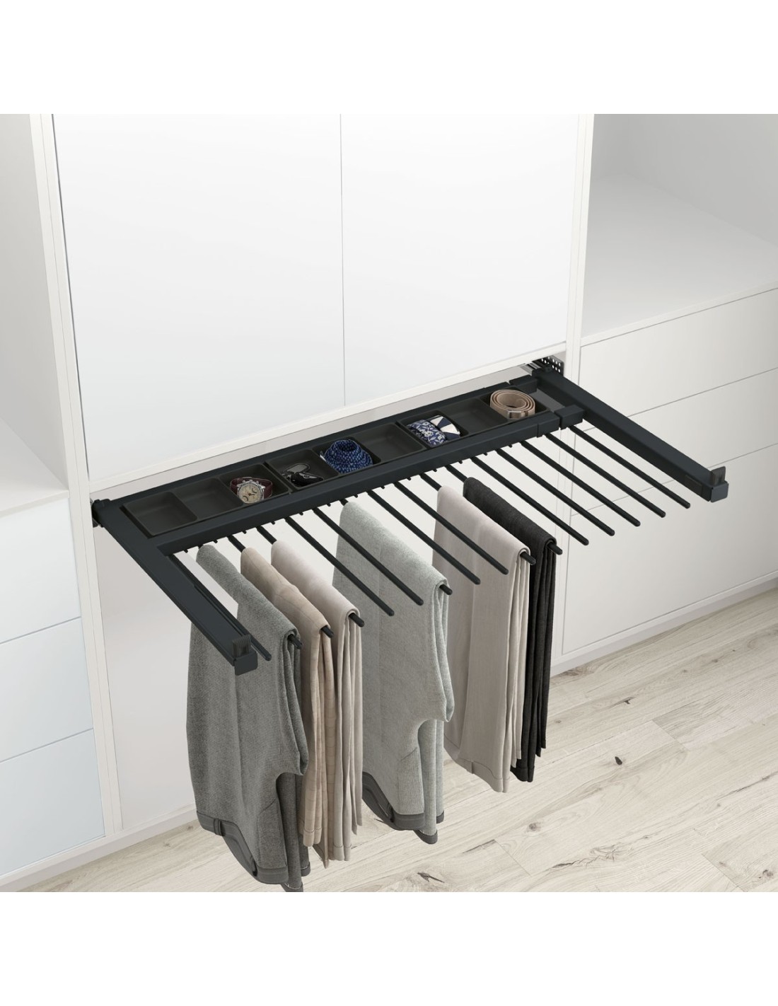 Pantalonero extraible Plus. Cuenta con soportes con funda antideslizante, con bandeja porta-objetos y con cierre amortiguado. Carga maxima de 30 Kg. Diseñado para 9 pantalones.
