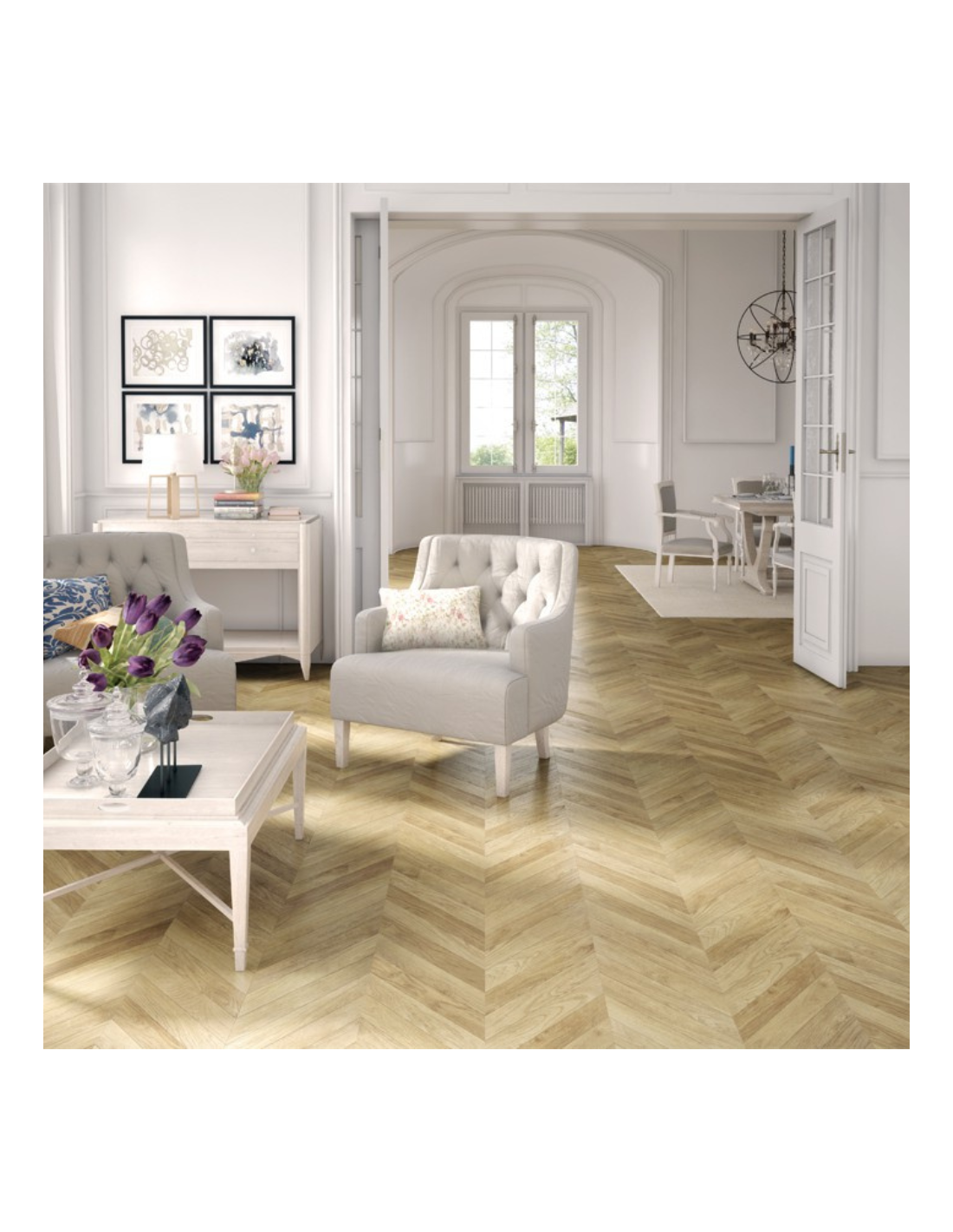 Paquete de suelo Faus de la colección Eco, suelo laminado hidrófugo. Esta unidad cuenta con 2,3 metros cuadrados por paquete.