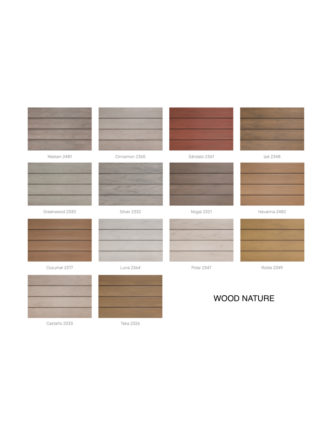 Inspirados en la sinuosa y heterogénea belleza de la madera, la colección Wood, ofrece su misma esencia pero con las prestaciones de Tarimatec, con una mayor resistencia y durabilidad que alarga la vida útil de este material y lo convierte en uno de los imprescindibles de la arquitectura y diseño del futuro inmediato. Lama de 250x15x2,7 cm. Tarimatec es lo que se llama material tecnológico y ecológico compuesto por policloruro de vinilo, cáscaras de arroz y piedra caliza, todo ello le da una resistencia, flexibilidad y durabilidad perfecta para exteriores siendo, además, totalmente hidrófugos e ignífugos lo que confiere al producto unas inmejorables cualidades técnicas. Portes no incluidos, precio por metro y lama.