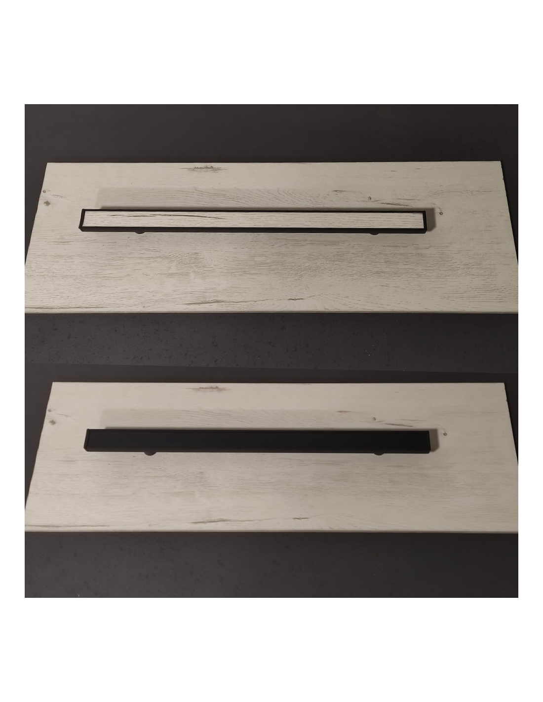 Tirador Imagine negro con canto de PVC a juego o a contraste con la puerta o cajón. El tirador incluye el canto, dos tapas y pivotes separadores con tornillo (cantidad de pivotes según medida). Tirador perfecto para quien quiere un tirador largo pero se ha de adaptar a los agujeros ya existentes en el mueble, pues los pivotes se regulan en distancia. Se puede hacer tipo pomo. La distancia de 26cm es la que corresponde a una distacia de tornillos de 19,2cm. Precio por tirador